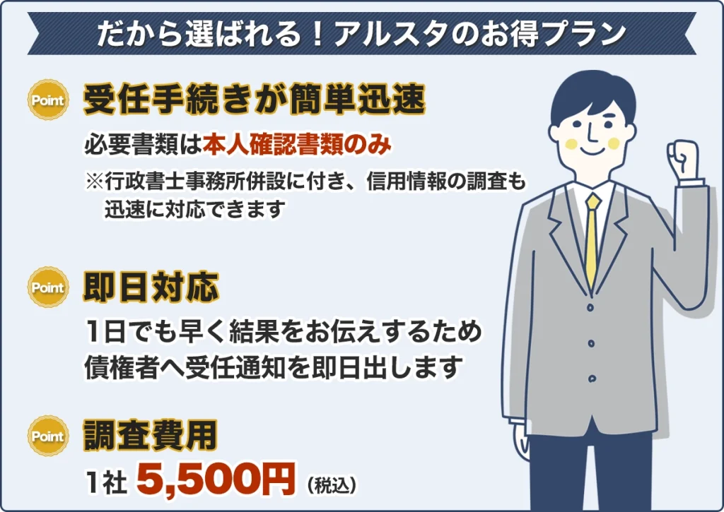 | 費用 | 相談無料 調査費用 1社 5,500円(税込) |